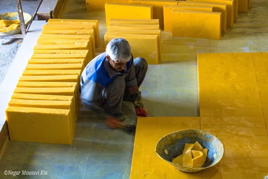 سودسوز آور ، نمک و آب و چربی حیوانی ، همراه با مواد افزودنی ! به هم که میخورد ، وارد یک حوضچه شده تا کمی خشک گردد .سپس بر اساس قالب ، بریده شده و با حرارت خشک شده و محصول نهایی میشود صابون سنتی مراغه. همان که هنوز بسیار کارآمد تر از صابونهای شیمیایی امروز هست !