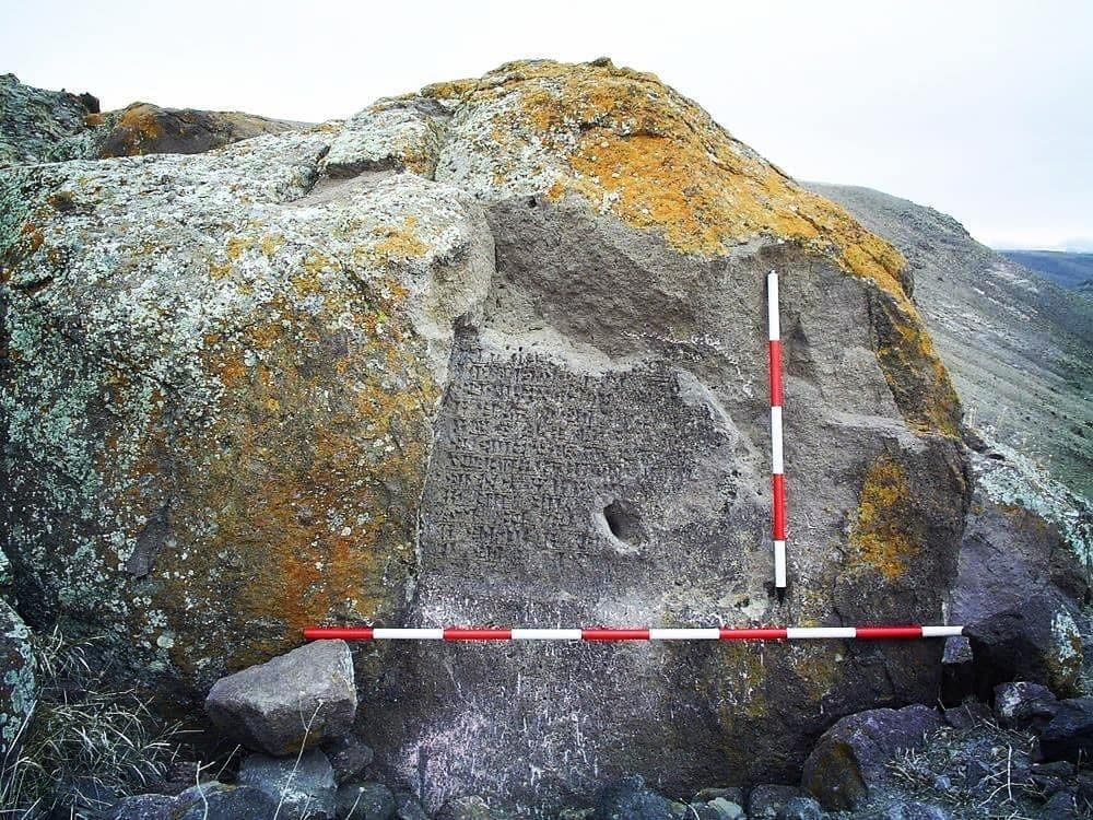 کتیبه مزبور به زبان اورارتویی و به خط میخی منسوب به قرن هشتم قبل از میلاد بر روی صخره ای به طول به طول ۵.۴ متر و عرض ۱۰.۲ متر نقر شده است. در اطراف کتیبه در مسافت دورتری در شمال کتیبه فوق معبد بزرگ سنگی وجود دارد.