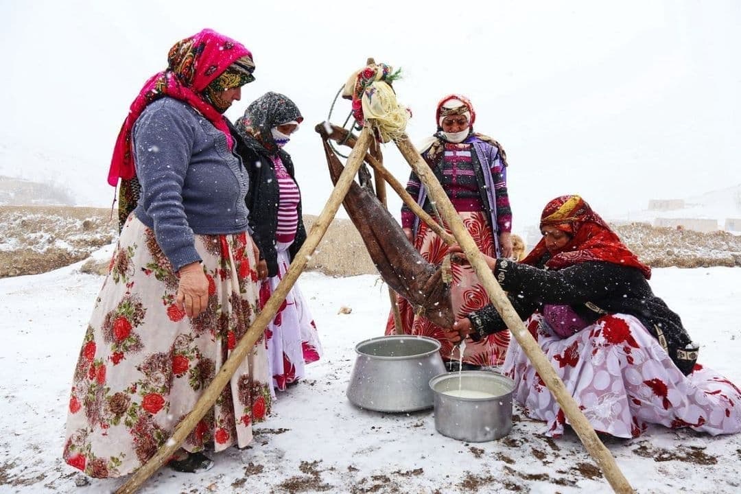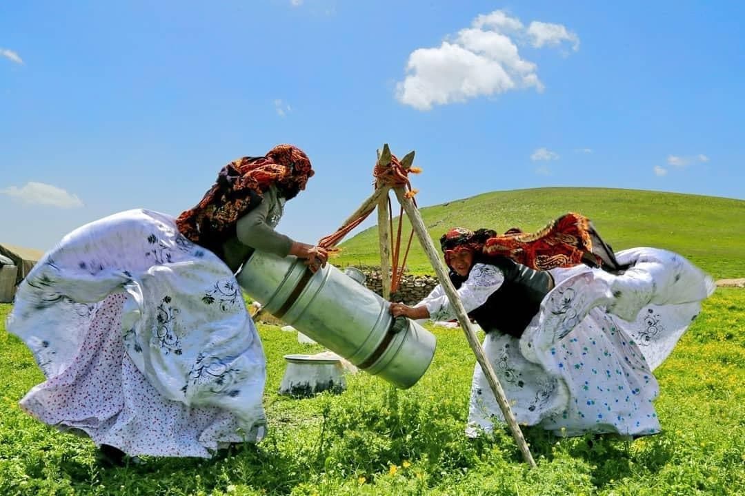 زنان عشایر ارسباران در حال تولوق چالماق (آیین مَشک زنی و کره گیری) کره گیری سنتی ( نهره چالخاماخ nehra ĉâlxâmâx)